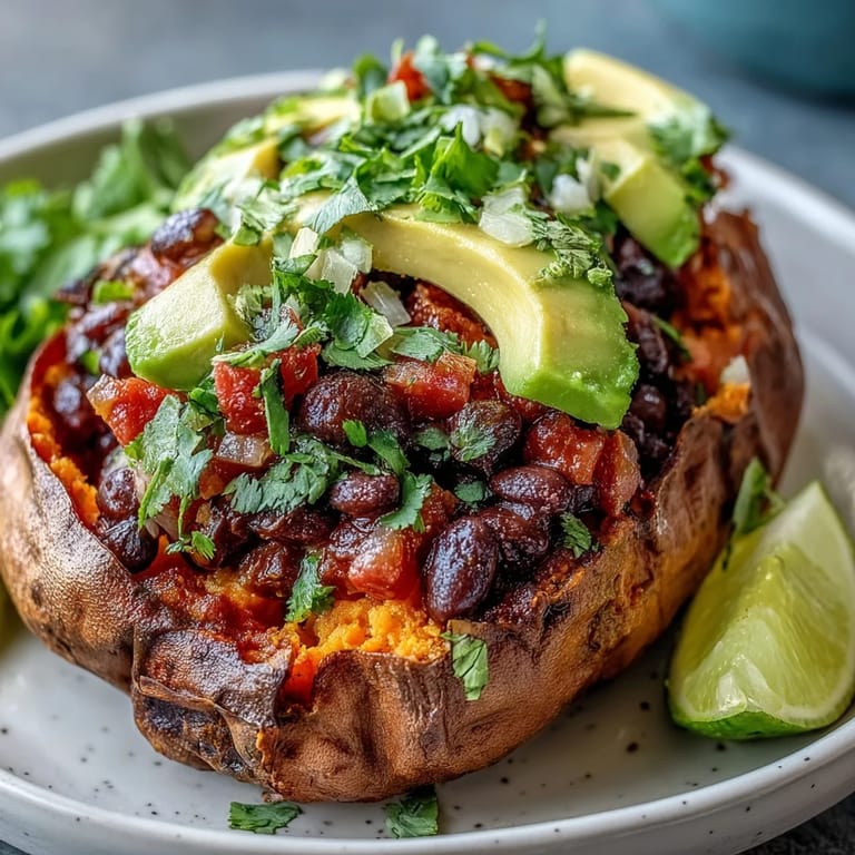 - Once the sweet potatoes are tender enough to split easily with a fork, slice each one open lengthwise and fluff the insides gently with a fork to create little pockets for toppings. Spoon the warm chipotle black beans generously over each potato, top with a heaping spoonful of bright tomato salsa, and finish with avocado slices, extra cilantro, and a lime wedge for squeezing.